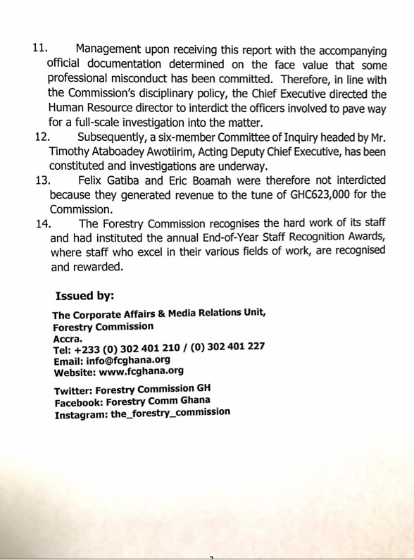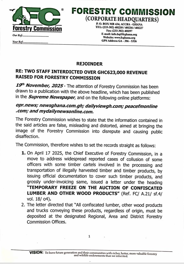 19th November, 2025 — The attention of the Forestry Commission has been drawn to a publication circulating in the Supreme Newspaper and on various online platforms, including opr.news, newsghana.com.gh, dailyviewgh.com, peacefmonline.com and mydailynewsonline.com, alleging that two staff members were interdicted after generating ȼ623,000 for the Commission.