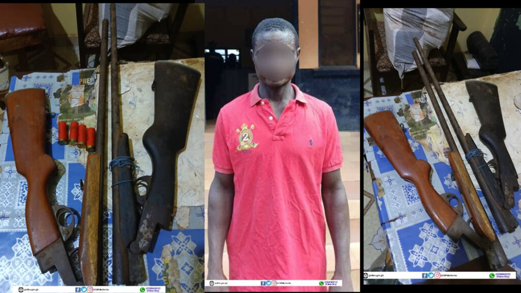 A search of the premises led to the discovery of two single-barrel guns and four AAA ammunition hidden in the room of Francis Donkor, 50. The suspect was promptly arrested and is currently in police custody, assisting with ongoing investigations.