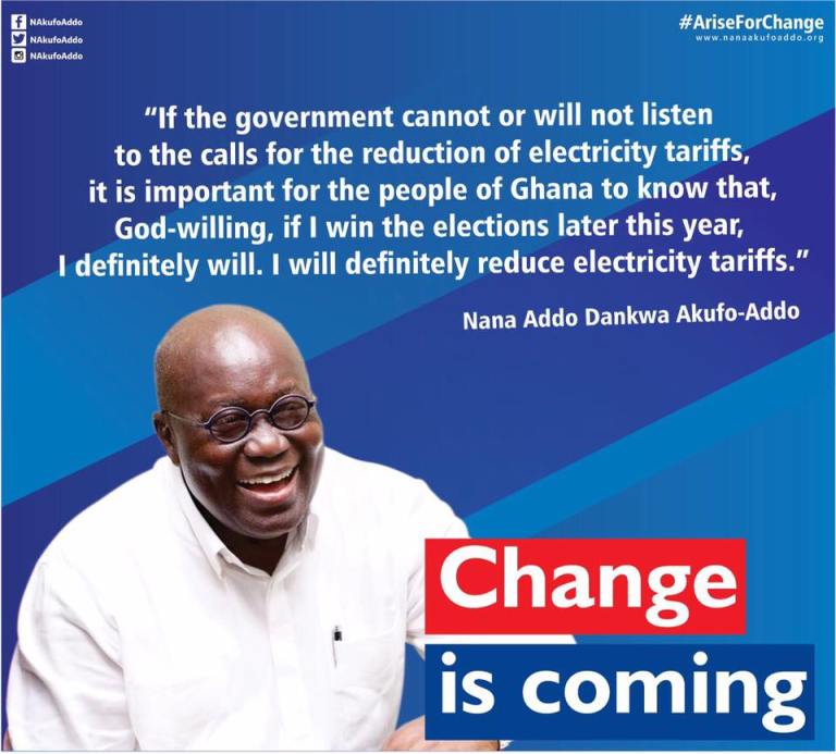 “If the government cannot or will not listen to the calls for the reduction of electricity tariffs, it is important for the people of Ghana to know that, God willing, if I win the elections later this year, I definitely will. I will definitely reduce electricity tariffs,” Akufo-Addo told Ghanaians on his social media page in 2016.