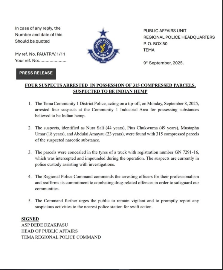 The Tema Community One District Police have arrested four suspects for possessing substances believed to be Indian hemp.