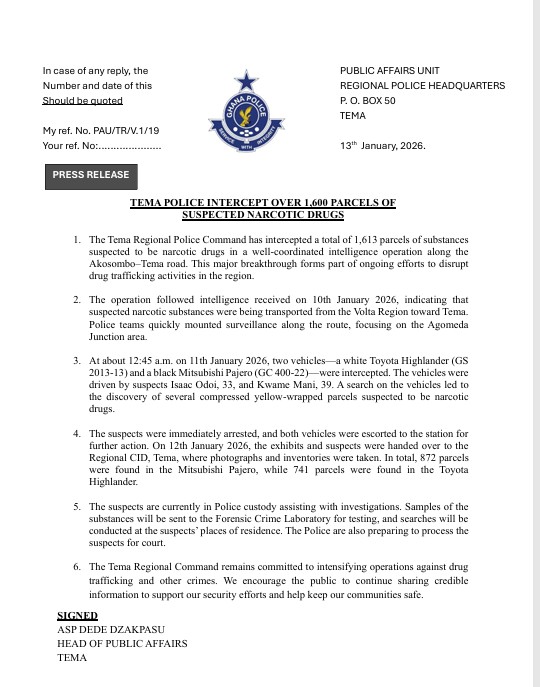 The Tema Regional Police Command has intercepted 1,613 parcels of substances suspected to be narcotic drugs in a major intelligence-led operation along the Akosombo–Tema road, marking a significant breakthrough in the fight against drug trafficking in the region.
