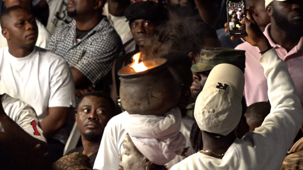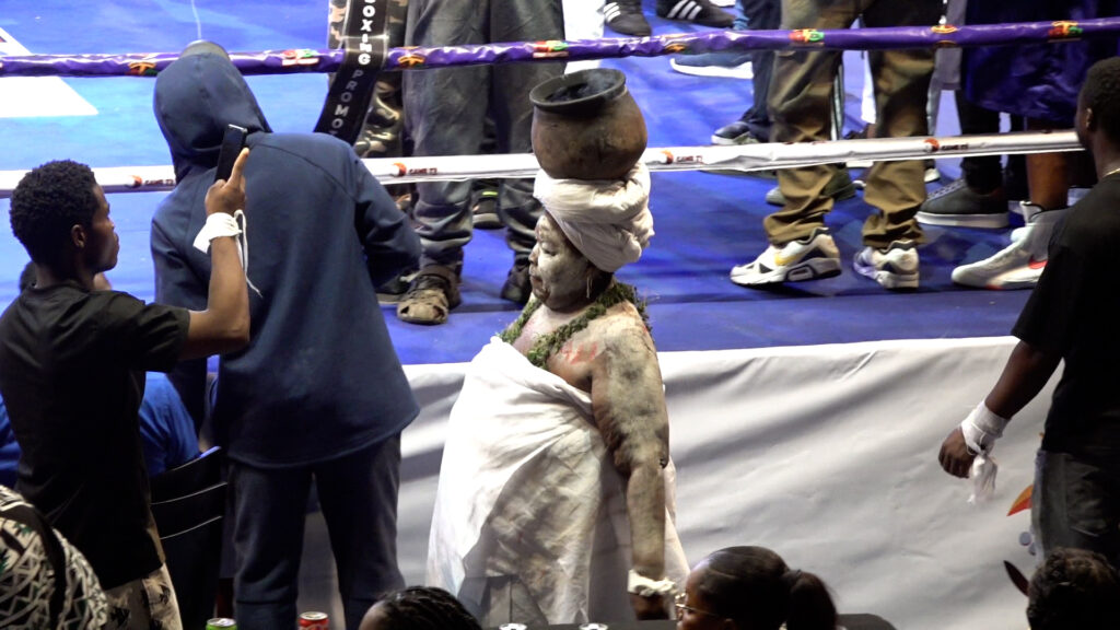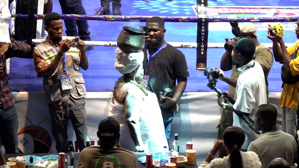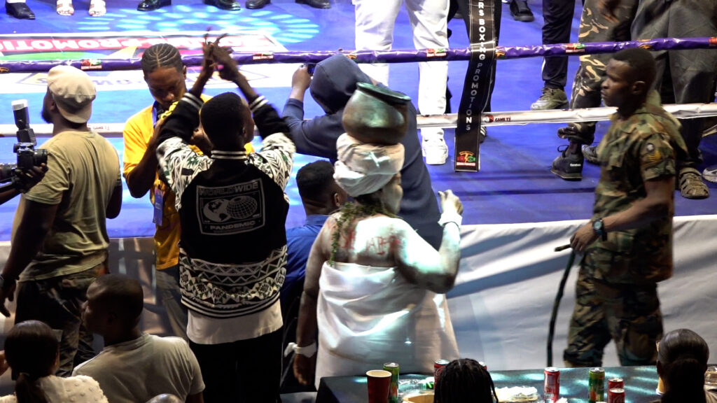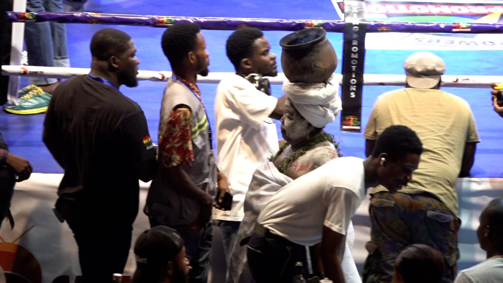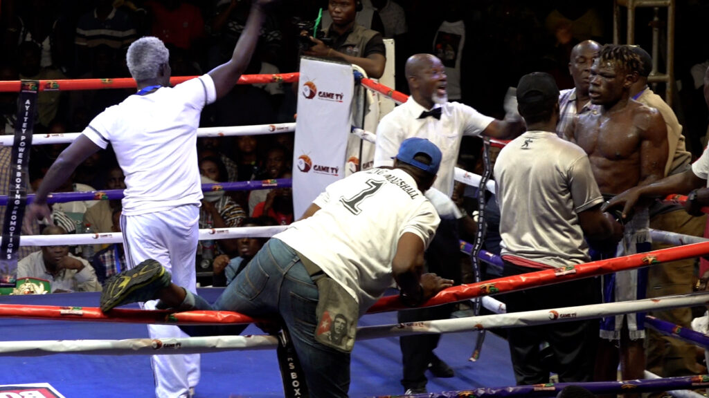 This sparked heated murmuring and gossip among the teaming patrons, who were unsure about what exactly brought about the temporary halt and why the gloves of Baubali were being changed. After a while, the head trainer of Soldier Boxer, and one of the assistant coaches of the National Amateur boxing team, Coach Lartekoi Lartey, jumped into the ring in protest, demanding to know what was happening. His action was misread by the support base and corner of Baubali leading to the throwing of missiles into the ring. The security took control of the ring but the outrage continued leading to patrons including the officials running for safety.