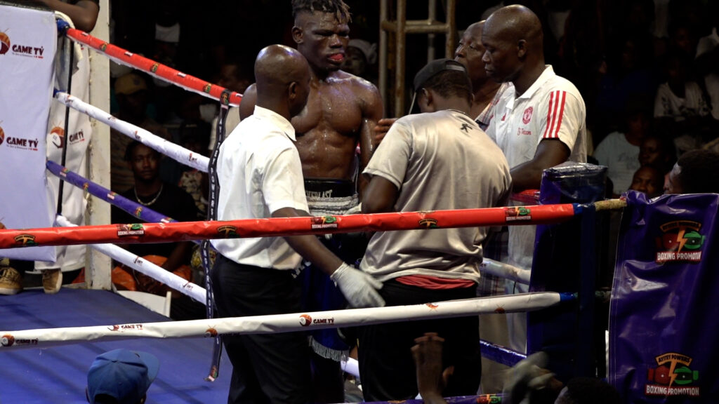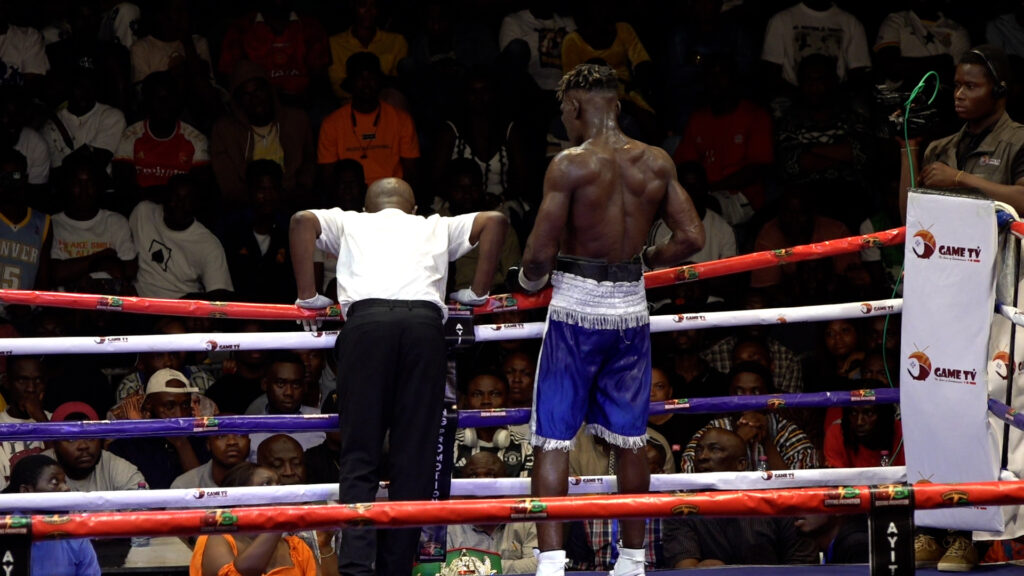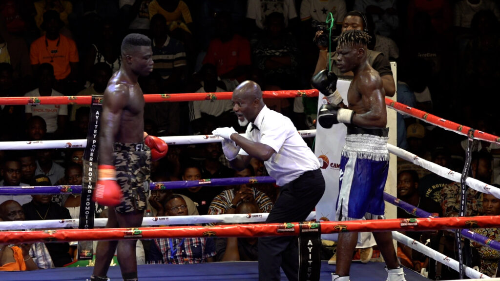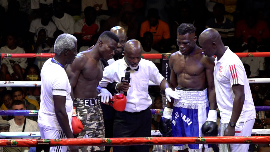 The much-taunted National Super Middleweight Championship between Elvis Ahorgah (Soldier Booxer) and Ernest Akutsey, aka, Baubali, ended in a no-contest during round 6. One-time SWAG boxing referee of the year, the venerable Roger Barner called a temporal halt midway through the round after spotting a defect in Baulbaloo’s gloves. He aptly invited a ringside official and Ghana Boxing Authority, GBA chairman for promotion, Alhaji Multala Toufik, to explain and show him his observations. The two agreed there was a challenge that required changing the gloves. A pair of black gloves was immediately sorted, and Baubali was taken to his corner for the defective gloves to be replaced.