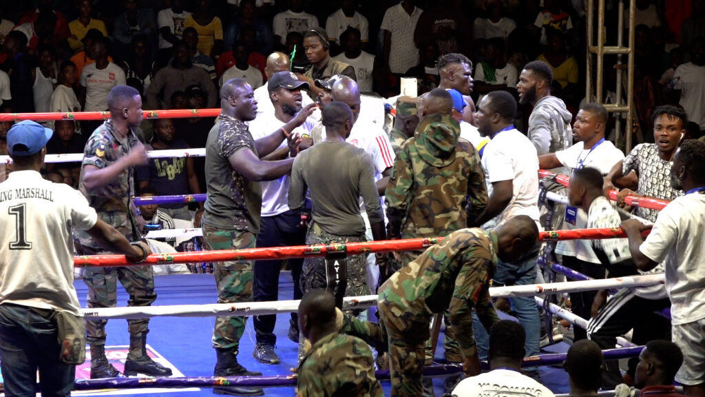 For nearly 30 minutes, the security remained in control of the affairs in the ring by protecting the two boxers from the flying bottled water and soft drinks mostly coming from Baubali’s corner side of the ring. Referee Roger Barnor was later spotted around the media centre in a changed attire. The previously packed Bukom Boxing Arena was virtually empty now and the boxers have no option but to vacate the ring disappointed. At the point of the stoppage though many patrons and journalists have scored Soldier Boxer ahead of his opponent, Baubali on points.