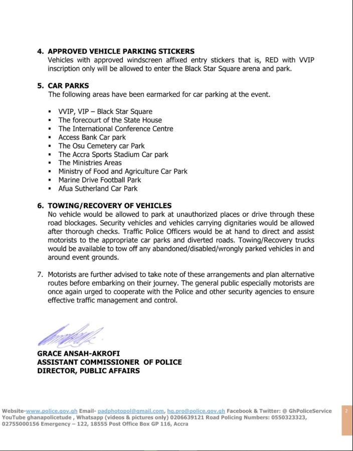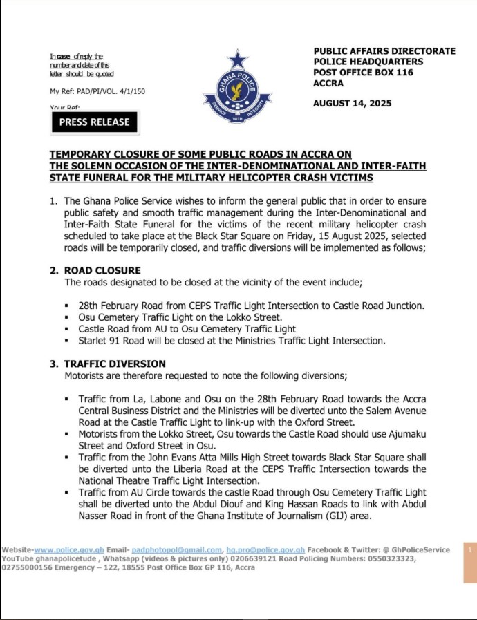 The Ghana Police Service has announced temporary road closures and traffic diversions to ensure public safety and smooth traffic flow during the Inter-Denominational and Inter-Faith State Funeral for the victims of the recent military helicopter crash.