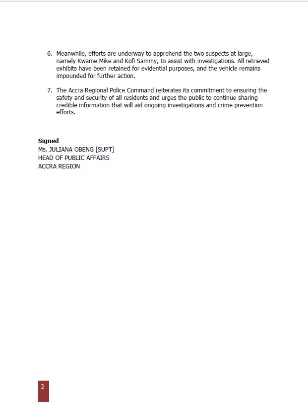 Meanwhile, efforts are ongoing to arrest the two suspects currently at large, Kwame Mike and Kofi Sammy, to assist with investigations. All retrieved exhibits have been retained as evidence, while the impounded vehicle remains in police custody for further action.