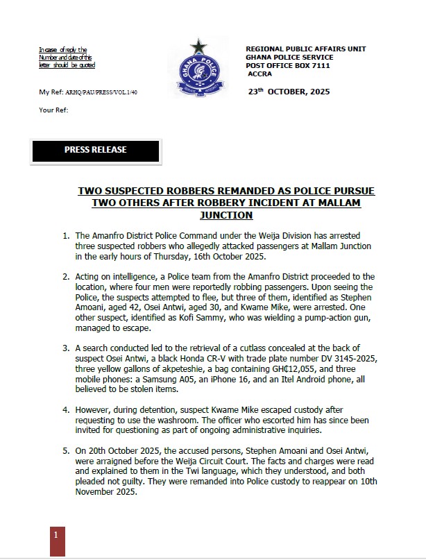 The Amanfro District Police Command under the Weija Division has arrested three suspected robbers in connection with a dawn robbery incident that occurred at Mallam Junction on Thursday, October 16, 2025.