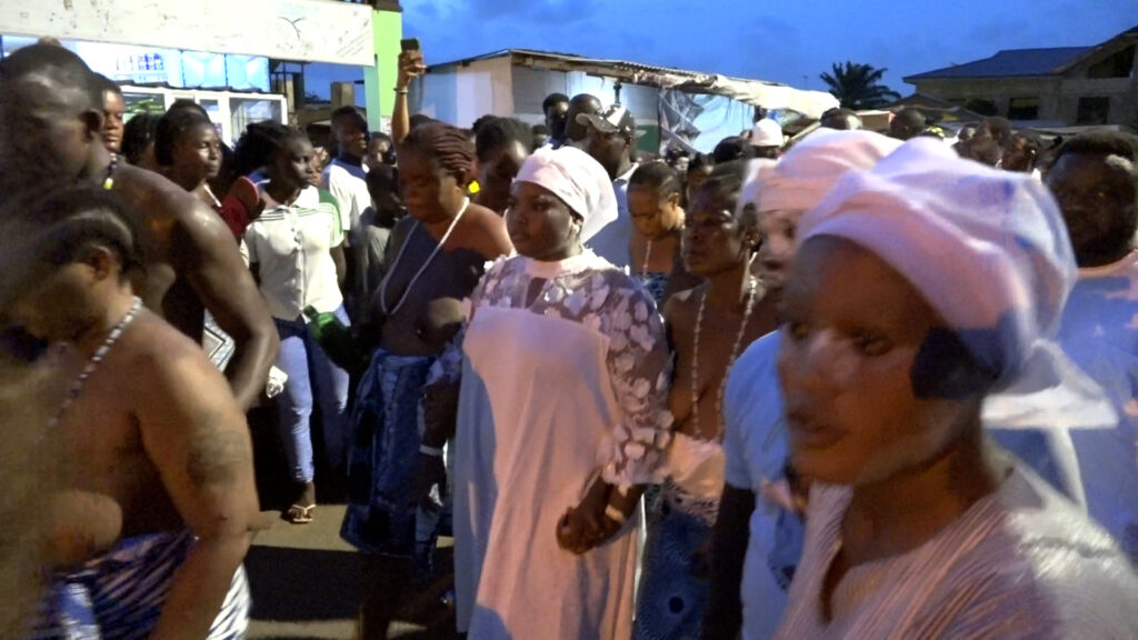 Accompanied by women, children, traditional priests and priestesses, she was greeted with chants and cheers along the procession route.