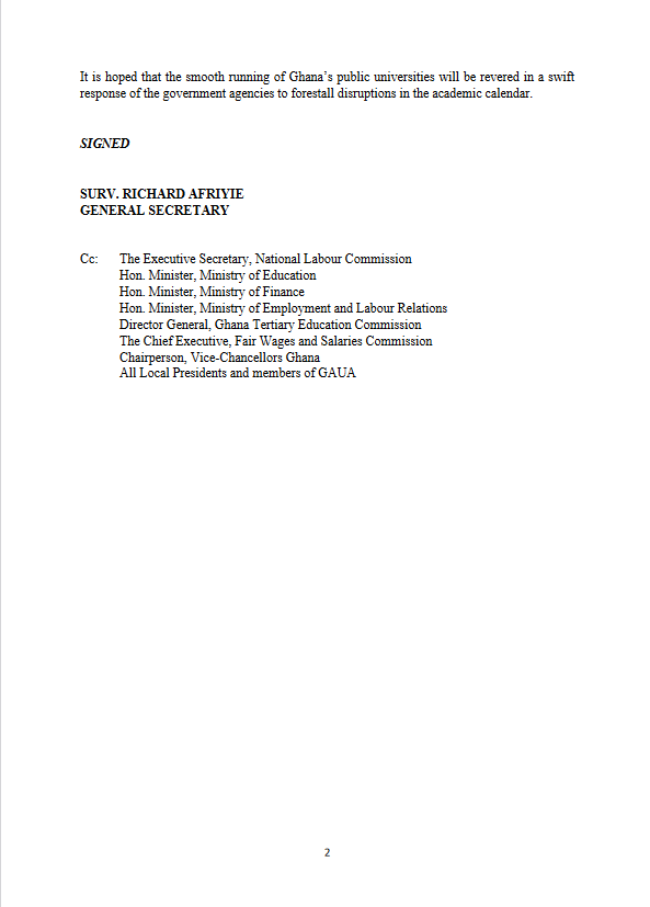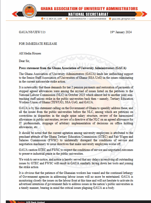 “GAUA caution GTEC and FWSC to respect the conditions of service and negotiated outcomes to preserve industrial peace in the public universities.”