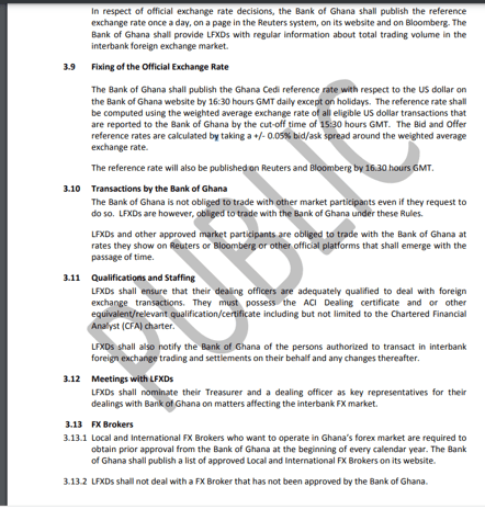 Section 3.9 says “The Bank of Ghana shall publish the Ghana Cedi reference rate with respect to the US dollar on the Bank of Ghana website by 16:30 hours GMT daily except on holidays. The reference rate shall be computed using the weighted average exchange rate of all eligible US dollar transactions that are reported to the Bank of Ghana by the cut-off time of 15:30 hours GMT. The Bid and Offer reference rates are calculated by taking a +/- 0.05% bid/ask spread around the weighted average exchange rate.”