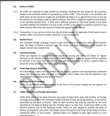 Find below what sections 3.4, 3.5, and 3.9 of the Ghana Interbank Forex Market Conduct rules say…