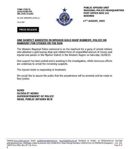 The Western Regional Police Command has launched a manhunt for a gang of armed robbers who attacked a gold-buying shop in the Mpohor District on Saturday, August 16, 2025.