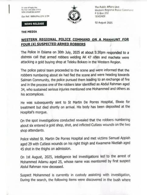 The Western Regional Police Command is on a manhunt for four armed robbers following an attempted robbery at a gold buying shop in Telebu Bokazo on July 30, 2025.