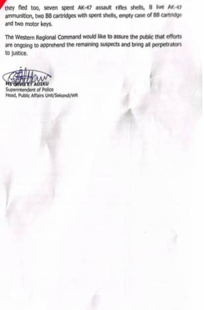 At about 5:30 pm, police in Esiama responded to a distress call reporting that a group of robbers armed with AK-47 rifles and machetes had attacked the shop. A police patrol team rushed to the scene and learned the suspects, about six in number, had fled toward the Salman community.