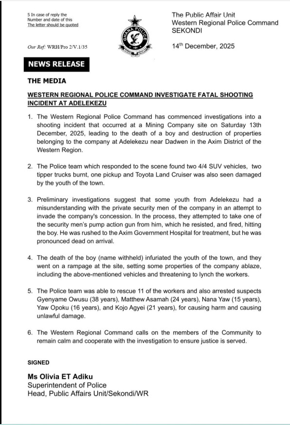 The Western Regional Police Command has launched investigations into a fatal shooting incident that occurred at a mining company site at Adelekezu, near Dadwen in the Axim District, on Saturday, December 13, 2025.
